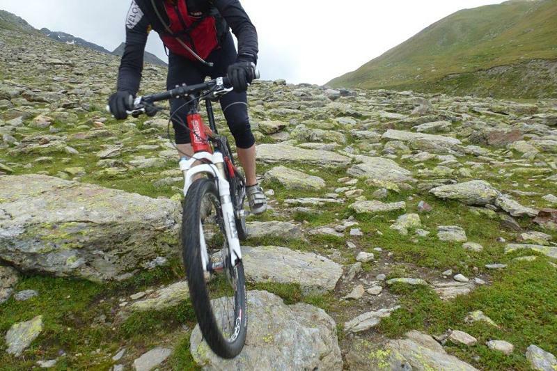 im Krieg ein strategisch wichtiger Gipfel mit Kanonenstellung über dem Stilfser Joch und gegenüber der österreichischen Stellung auf dem Ortler. Wirklich „Freeride”, also weglos, in die steile Schotterflanke gequert und dann Po hinter den Sattel und mit der Hinterradbremse die Schussfahrt sanft dosiert.